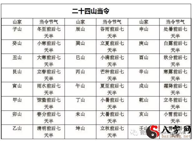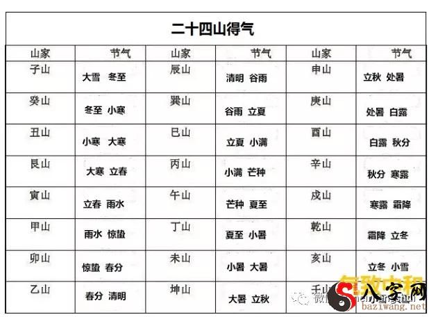 比如牛头山择于大雪冬至的三十天内,或癸山择于冬至节气小寒节气的三十天内,就称之为得气。下表为二十四山得气清单:
